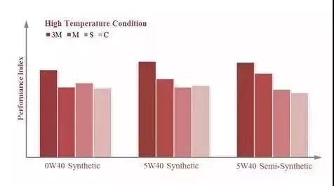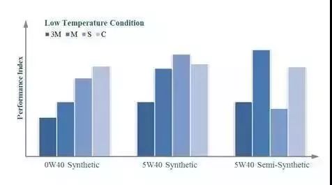 低温环境下粘度如果过高,反而会造成发动机冷启时,机油流动性较差,不能及时对零部件进行润滑,所以粘度较低的级别更好。图里就可以看到,5W40由于冬季级别标号值较大,四个品牌的粘度都要高于自家的0W40产品。而当确定级别时,低温流动性一样有所区别,0W40与5W40的全合成产品里,3M优于其他几款产品,而5W40的半合成产品,S牌以微弱的优势显著。